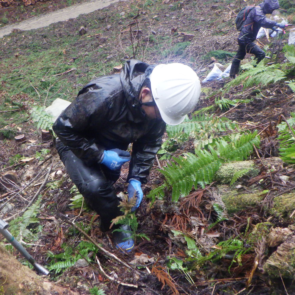 地拵えされた箇所に、苗畑で育てられたスギ苗やカラマツ苗などの目的樹種を1.8m~2m間隔で丁寧に植えていきます