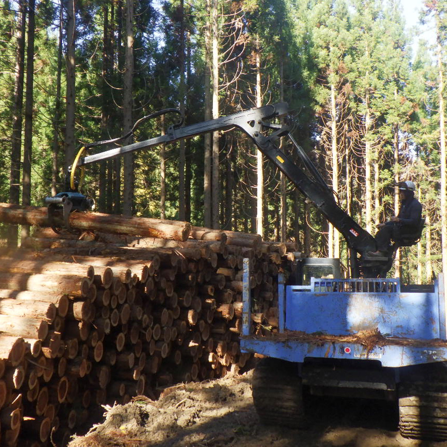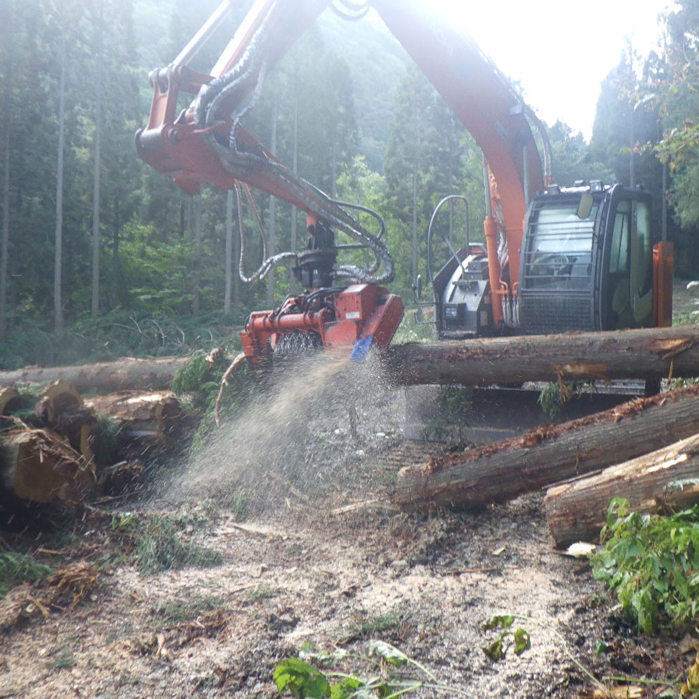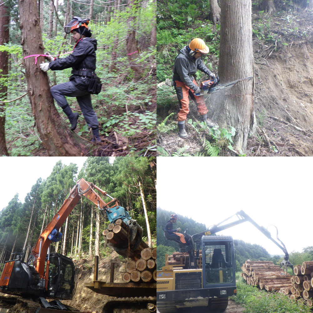 保育間伐を数回繰り返したのち、スギなどの目的樹種が更に成長し、林が混み合ってきたら、チェンソー、ハーベスタなどを使用し、間引きするとともに、プロセッサ、フォワーダなどの高性能林業機械を使用し、丸太を搬出し販売します