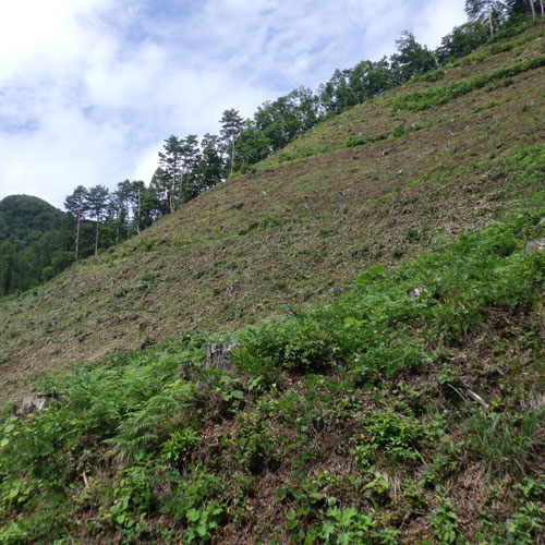 伐期齢に達した林分で、高性能林業機械等を使用し、全て伐採販売した後、スギやカラマツなどの苗木を再度植栽し、更新を図ります