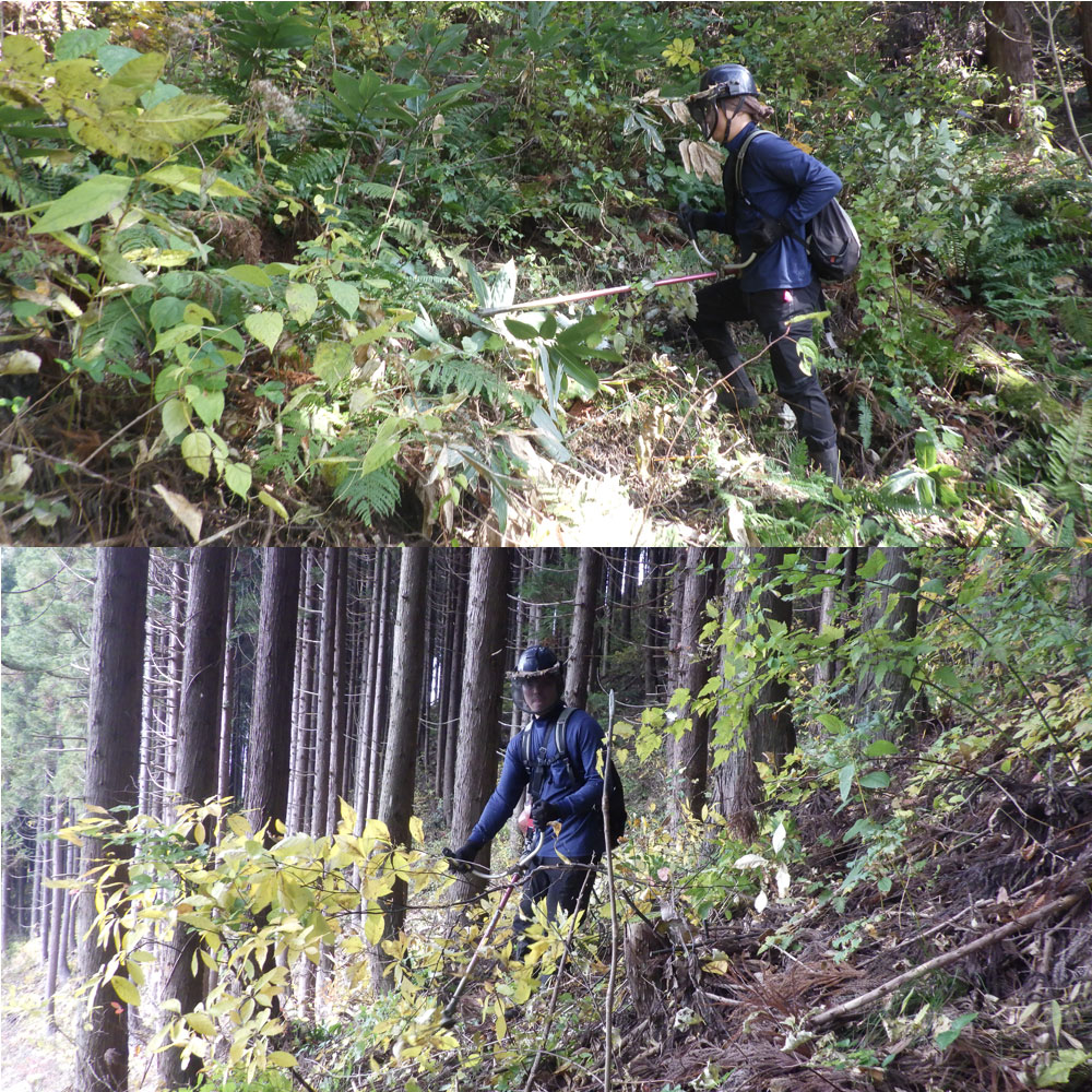植付けされた場所で、スギ苗などの目的樹種の成長を阻害する下草を丁寧に刈払います