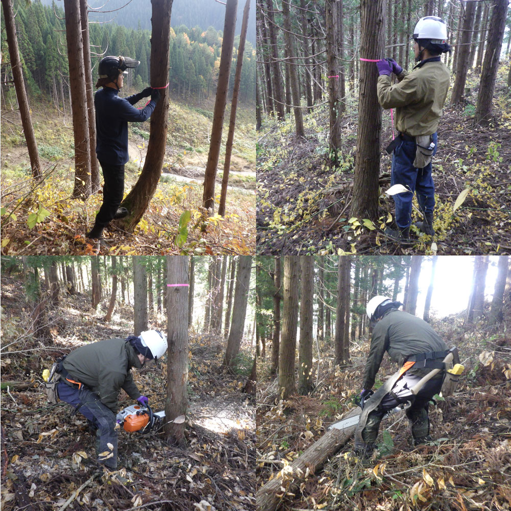 スギなどの目的樹種が成長し、林の中が混み合ってきたら、チェンソーを使用し間引きます