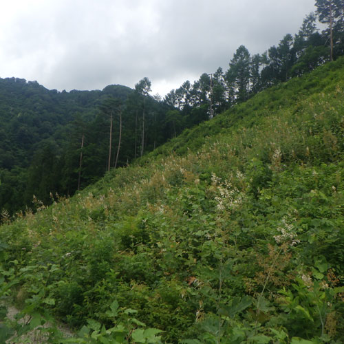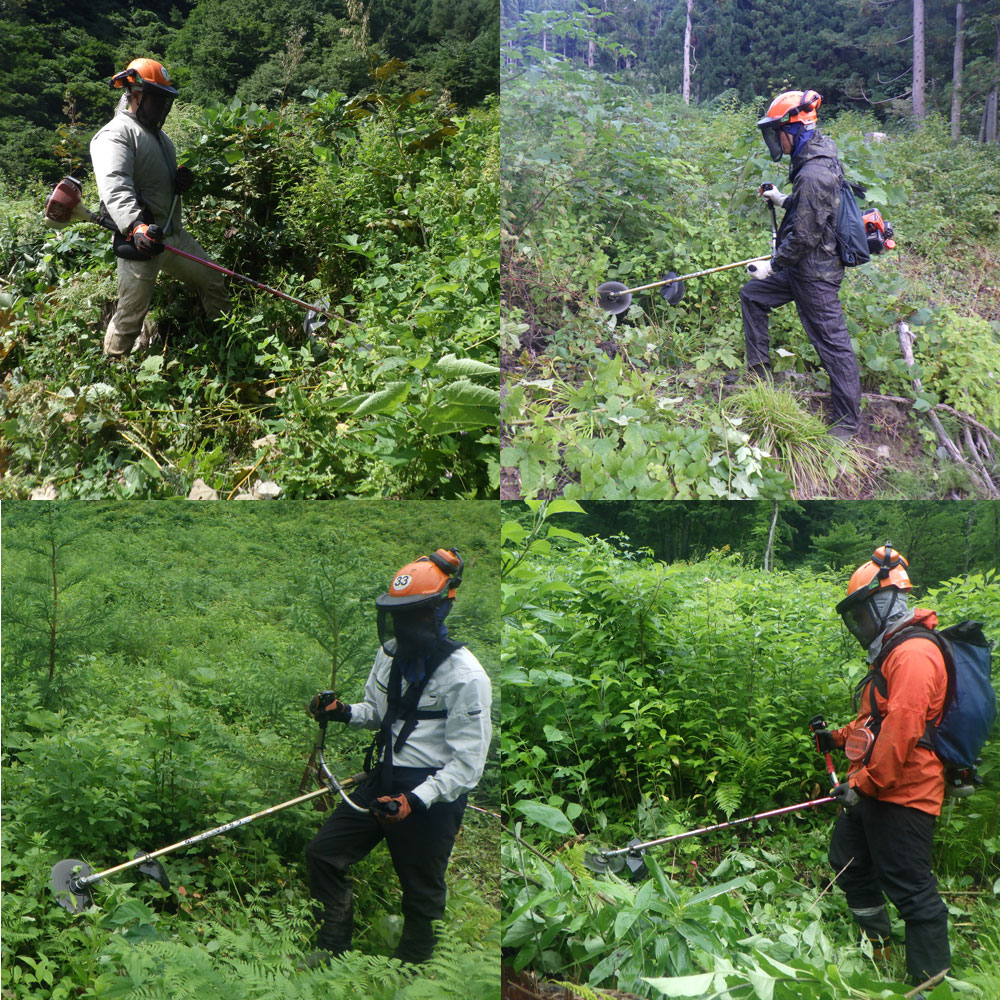 植付けされた場所で、スギ苗などの目的樹種の成長を阻害する下草を丁寧に刈払います