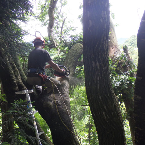 スギなどの目的樹種が成長し、林の中が混み合ってきたら、チェンソーを使用し間引きます